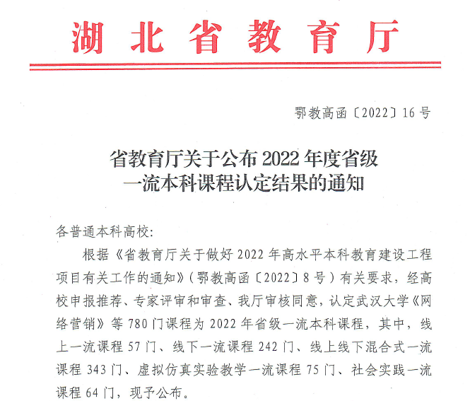 近日,湖北省教育厅发布《省教育厅关于公布2022年度省级一流本科课程认定结果的通知》公司熊艳老师的《有机化学A》被认定为省级一流本科课程。