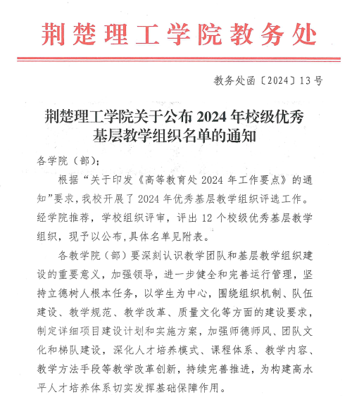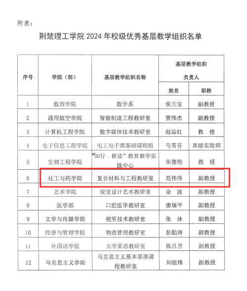 近日,公司教务处公布了2024年校级优秀基层教学组织评选结果,公司复合材料与工程教研室获批伟德国际1946官网2024年校级优秀基层教学组织。